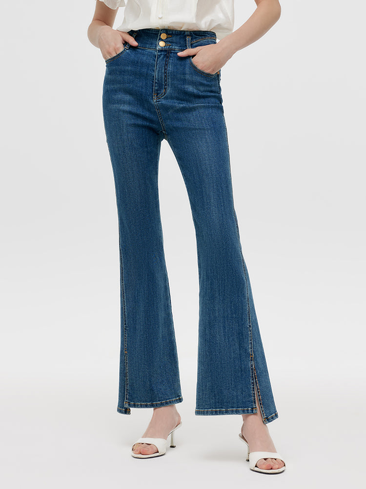 Made from durable denim fabric that is both comfortable and breathable, these flared jeans are a timelessly stylish choice. The unique rhinestone detailing on the slit adds a touch of glamour, making these jeans suitable for both casual outings and more formal occasions. It can be worn with any top and is a closet must-have.