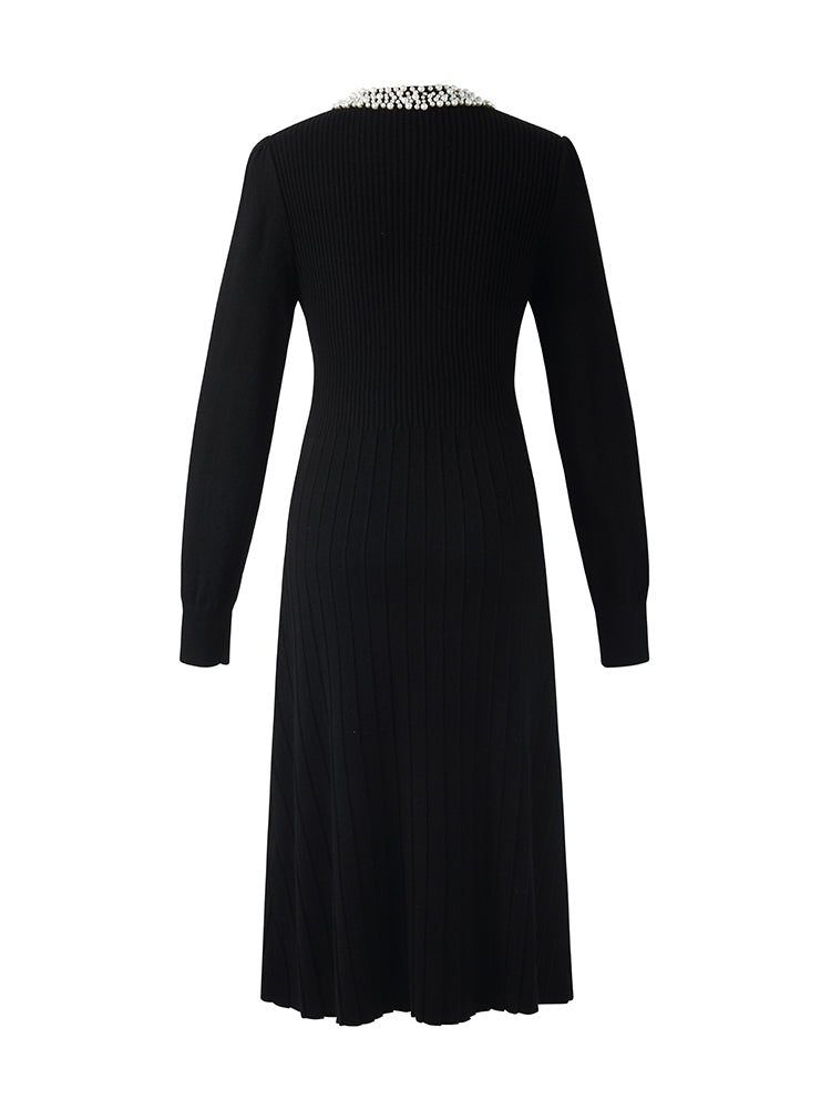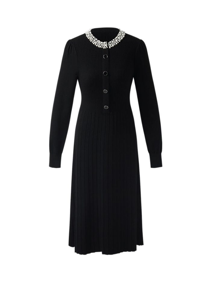 Discover elegance and comfort with our wool blend dress, designed to accentuate your curves with its A-line fit. Embrace the season with its sophisticated pearl-trimmed neckline, perfect for pairing with your favorite coats. Unleash your feminine charm this fall and winter with effortless style.