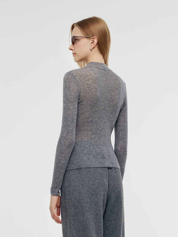 This lightweight and soft water-soluble machine washable Merino wool top is comfortable and skin-friendly, with tiny sequins for a delicate touch. The mock neck offers warmth and versatility, perfect for pairing with any style of bottoms or outerwear. A wardrobe staple that effortlessly elevates style, it’s the perfect blend of comfort and sophistication.